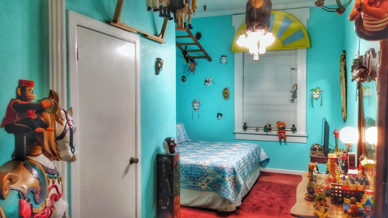 Room 7 is an upstairs room featuring 1 King Bed with 261 Square feet. This is one of our Themed rooms based off of our Carnival antiquities. This room has a maximum of 2 people. Ball and Claw bathtub, large flat screen television with an Amazon Fire stick and high speed wireless Internet.